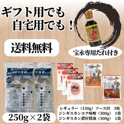 宝永にら餃子(スタンダード)250g(10個入)×2袋 宝永こだわりのたれ110ml 1本 ファイヤーバーグレギュラー 3枚 すみれ監修ジンギスカン(コク味噌) 1袋 (濃厚醤油) 1袋